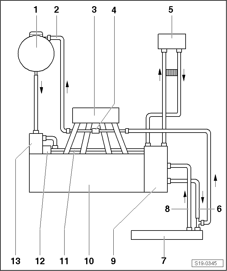 | Connection diagram for coolant hoses for engines with identification characters BXW as of 04/2009 and CGGB |