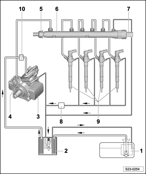 | 8 - | Fuel return-flow line with pressure holding valve |