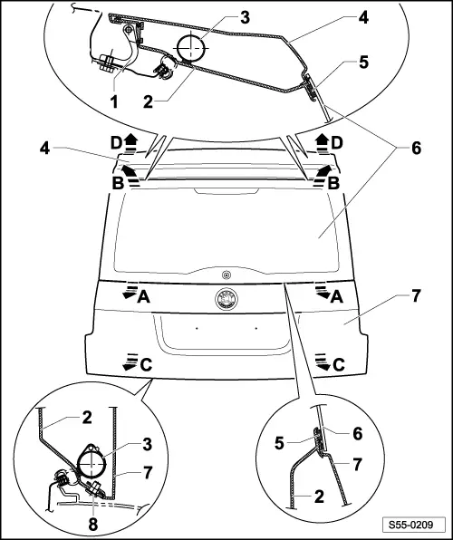 Note| The tailgate windscreen cannot be replaced individually! If damaged, the complete frame (Pos.3) with window, electrical installation and interior trim panel for tailgate (Pos.2) must be replaced. |