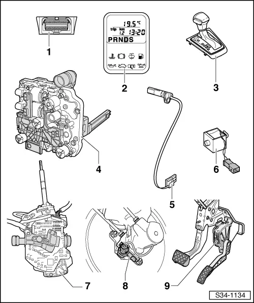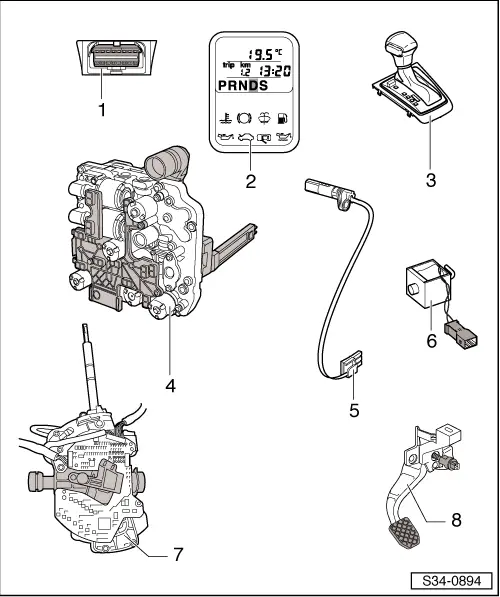 | q | Tiptronic switch -F189-, selector lever sensor control unit -J587- and selector lever switch locked in P -F319- are integrated into the shift mechanism. |