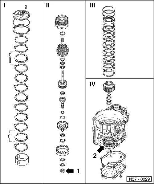 | II - | Removing and installing reverse clutch -K2- to small sun gear → Chapter |