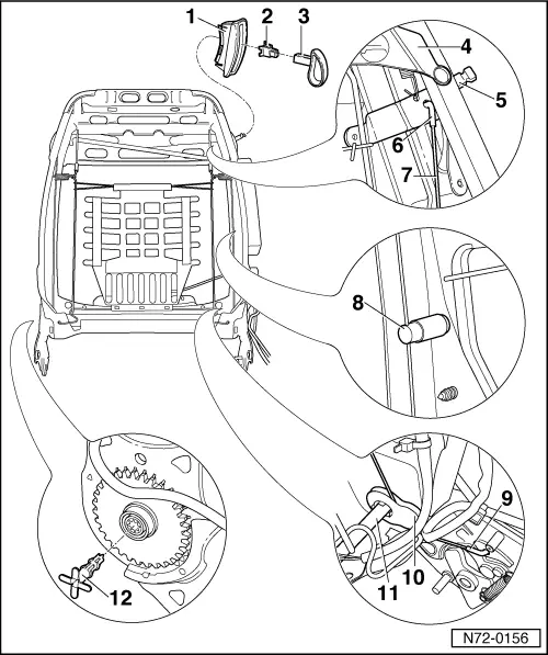 | – | Pull transfer rod -11- out of backrest frame until lower cable guide -10- can be unclipped. |
