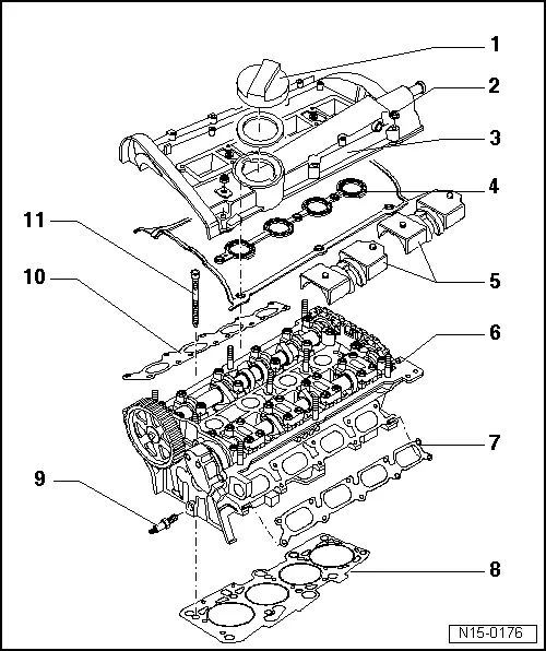 Note| t | When installing an exchange cylinder head with fitted camshaft, the contact surfaces between the bucket tappets and the cam must be oiled before installing the cylinder head cover. |