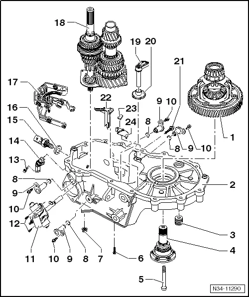 | Assembly overview - removing and installing input shaft, output shaft, differential, selector mechanism and selector forks |
