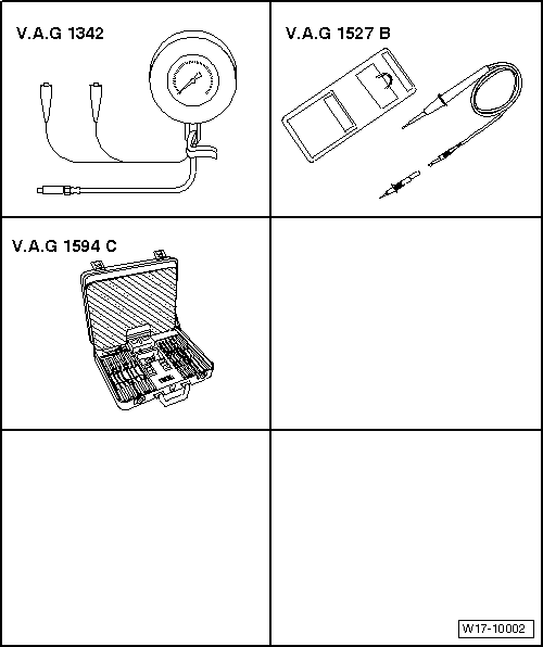 | Connect voltage tester -V.A.G 1527B- to battery positive (+) and oil pressure switch using cables from auxiliary measuring set -V.A.G 1594C-. LED must not light up. |