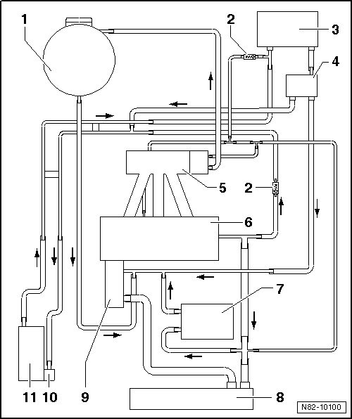 | Connection diagram for coolant hoses in vehicles with auxiliary heating, engine codes BGU, BSE, BSF, CCSA, CMXA, CHGA |