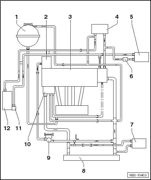 | Connection diagram for coolant hoses in vehicles with auxiliary heating, engine codes BYD, CDCA, CDLF |