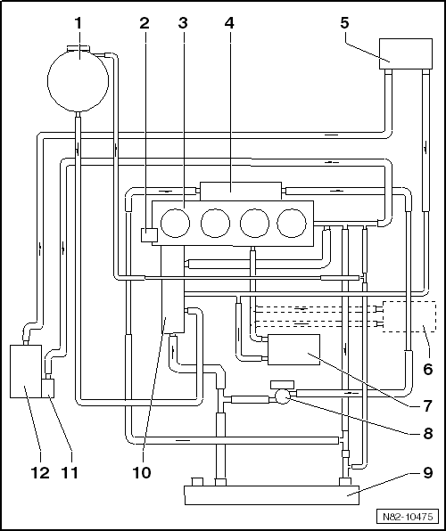 | Connection diagram for coolant hoses in vehicles with auxiliary heating, engine codes CFFA, CFFB, CFGB |