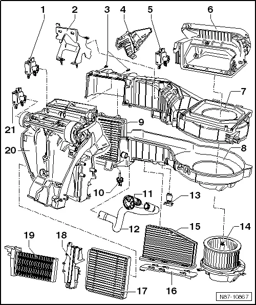 | Dismantling and assembling heater and air conditioning unit -VX1-, „manually regulated air conditioning system“ |