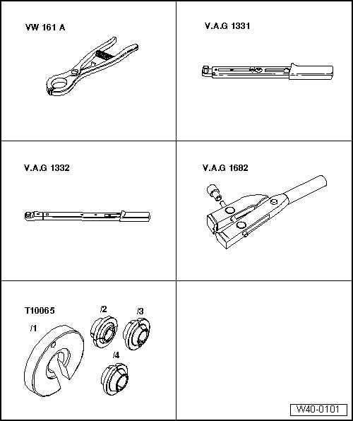 | q | Use clamp tensioner -V.A.G 1682- to tighten → Fig. |