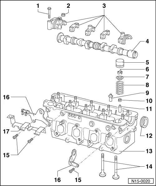 | q | Removing and installing: with cylinder head removed, use valve spring compressor -2037-; with cylinder head installed → Chapter. |