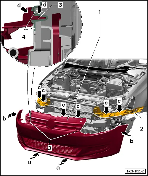 | – | Guide front bumper cover -1- parallel -arrows a- onto lock carrier. |